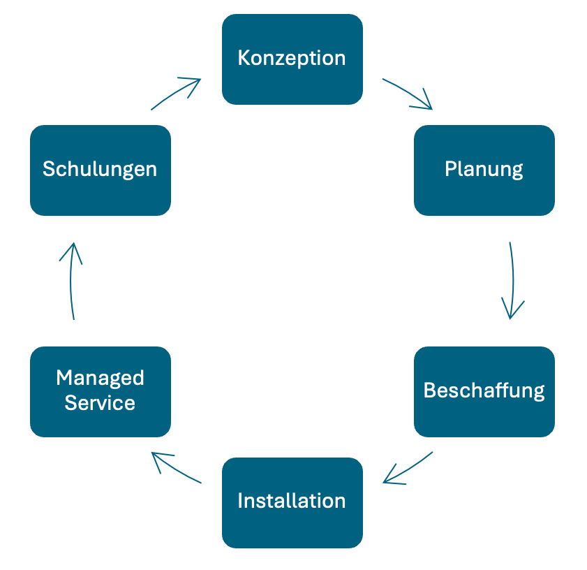 Damit Sie sich ganz auf Ihr Geschäft konzentrieren können, erhalten Sie bei uns alle Leistungen aus einer Hand: von Konzeption und Planung über Beschaffung und Installation bis hin zu Schulungen und Managed Services. So bleiben Ihre Systeme zuverlässig, aktuell und sicher – und Ihre Teams optimal unterstützt.